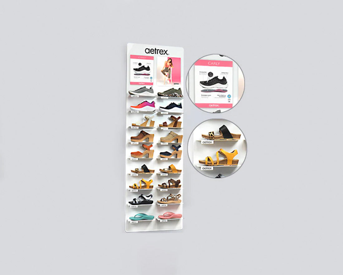 Enhance your footwear presentation with our clean white slatwall panel, designed to showcase 18-22 shoes. This display includes two slatwall sign holders to highlight the Aetrex difference, along with graphics and shoe shelves for added visual impact.